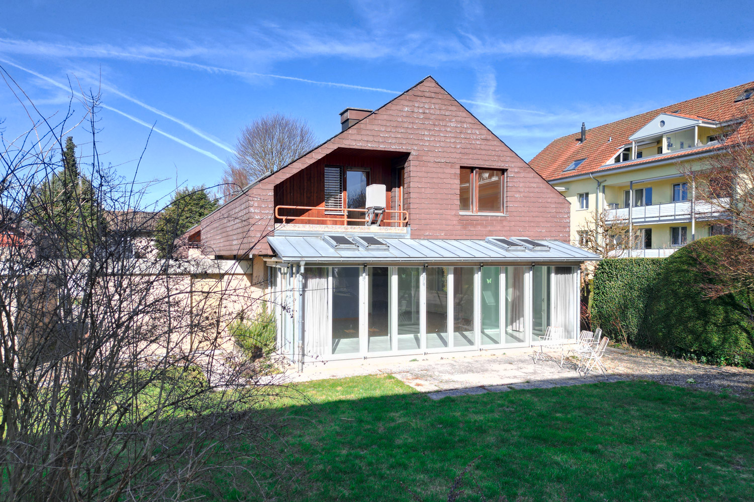 Das Einfamilienhaus überzeugt mit sechs grosszügigen Zimmern, zwei Nasszellen, einem lichtdurchfluteten Wintergarten und direktem Gartenzugang.